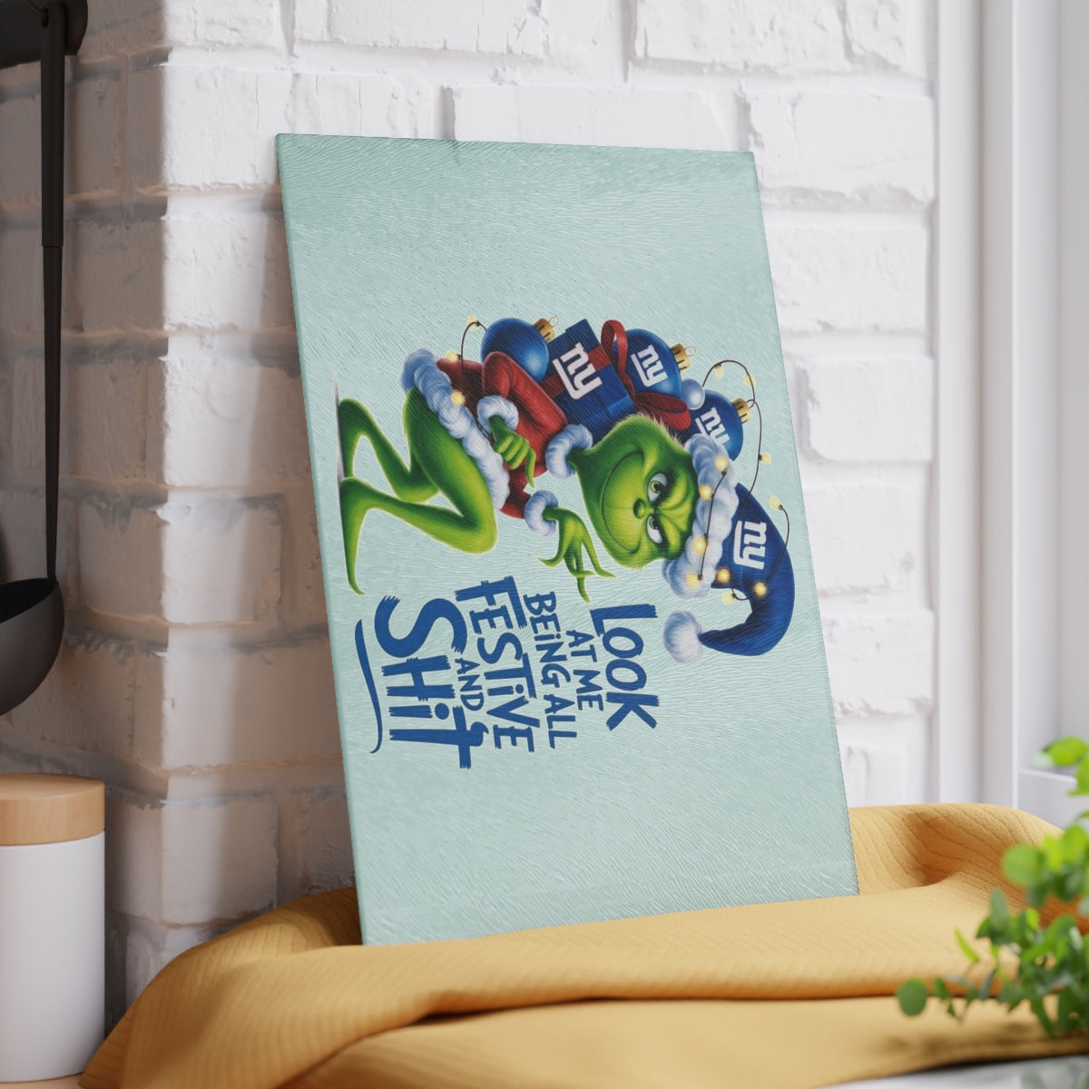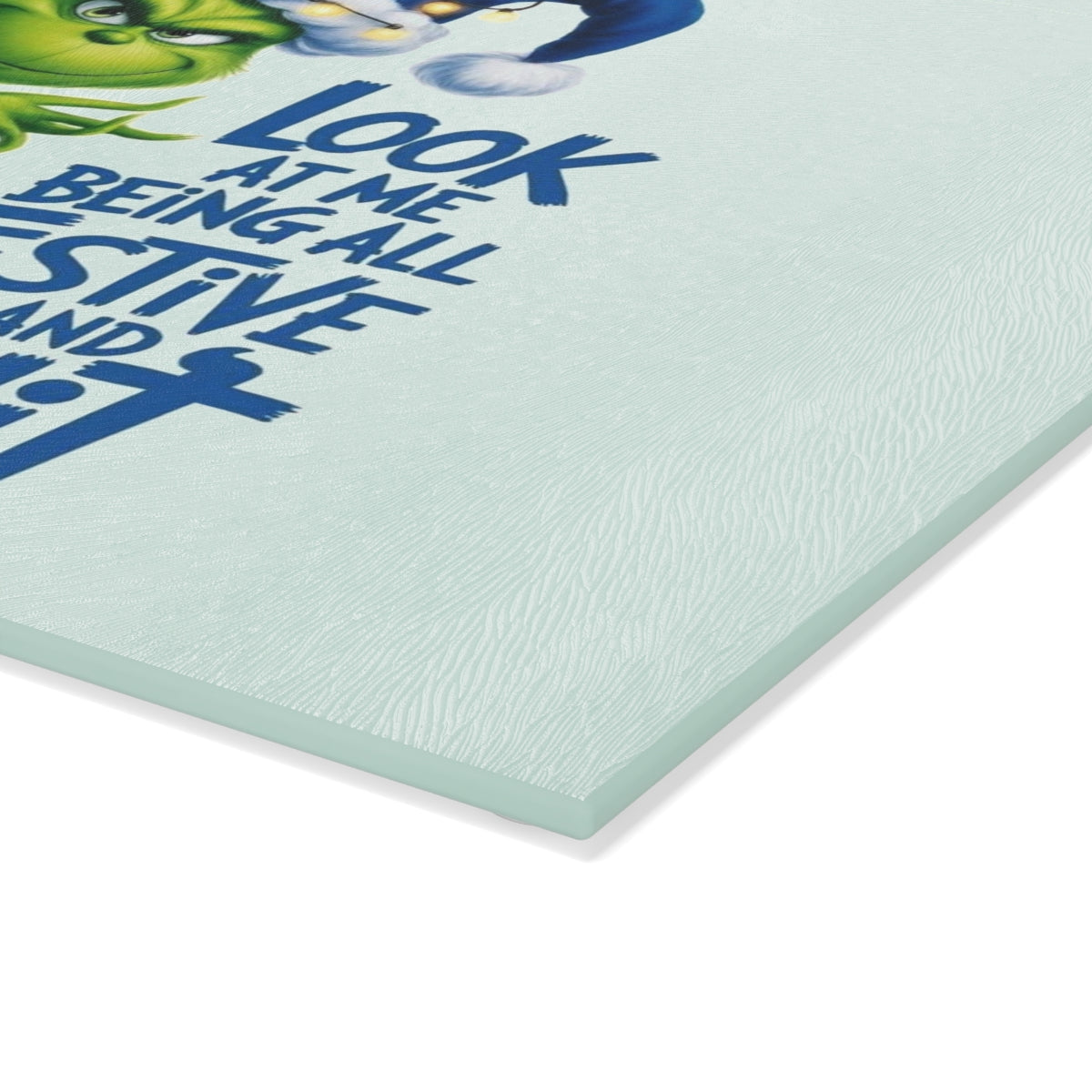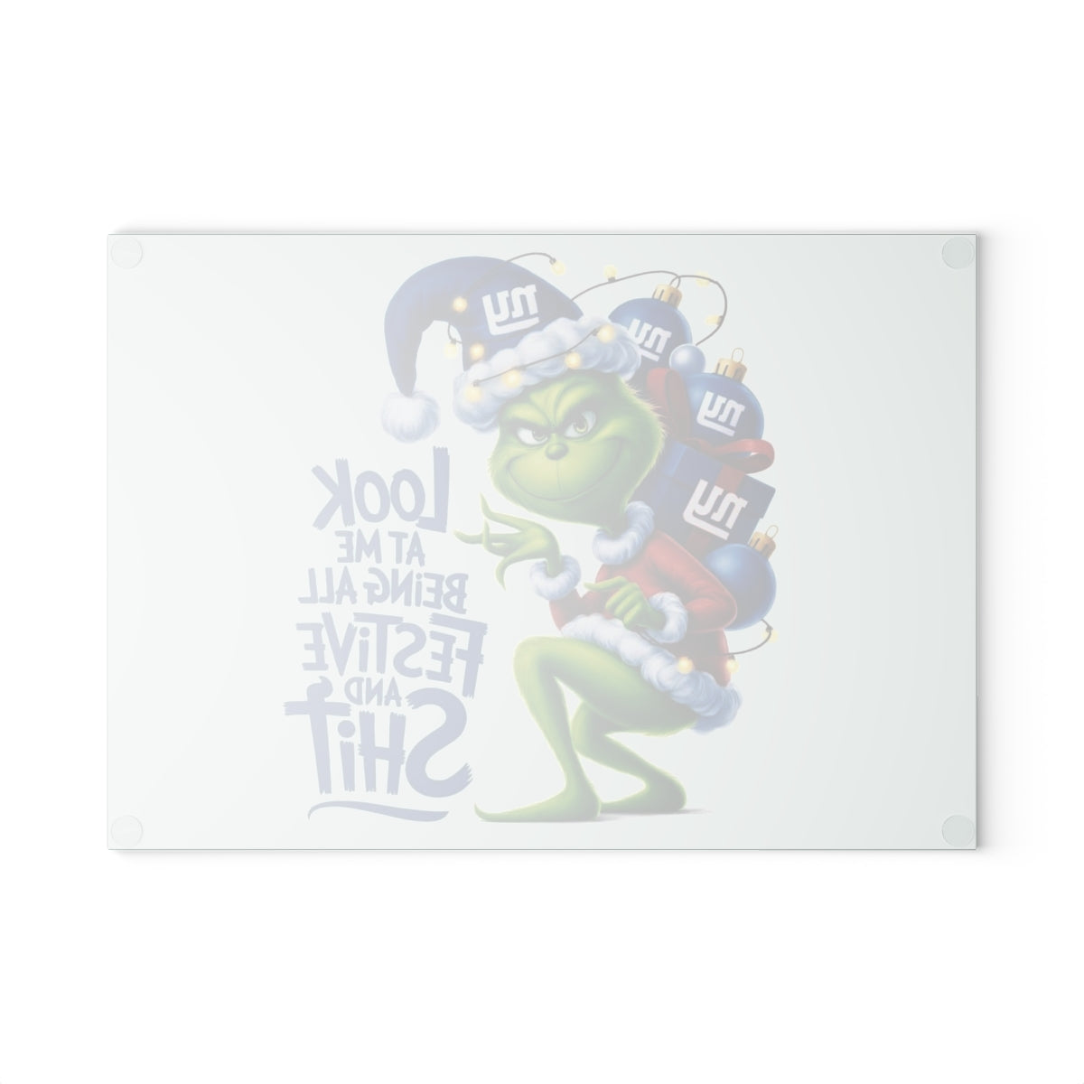 A cheeky, spirited kitchen glass cutting board that brings holiday mischief to your countertop. The textured tempered glass surface showcases a bold, colorful picture or custom design.