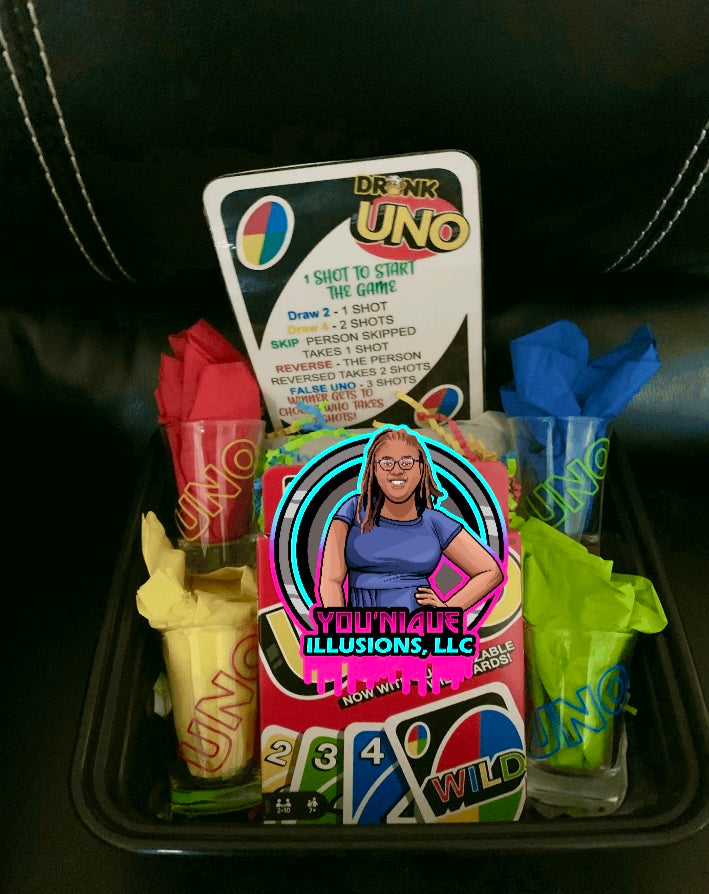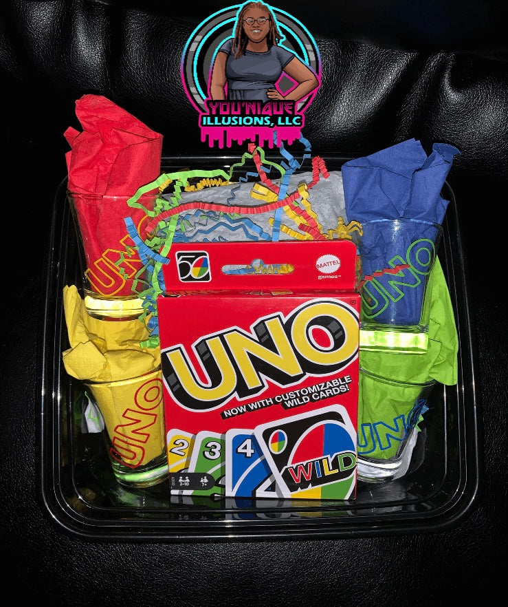 Everyone loves a good game of Uno, but sometimes we need some adult time! Well here is Uno with a twist! Drunken Uno comes with a deck of Uno cards that can be customized, 4 Uno shot glasses and The Drunken Rules!!